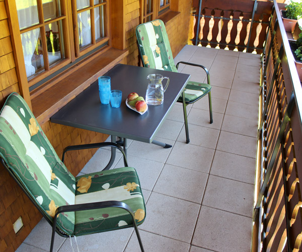 Der ca. 5 m² große Balkon mit Blick nach Süden ist mit Liegestühlen, Tisch und Sitzgelegenheiten ausgestattet.